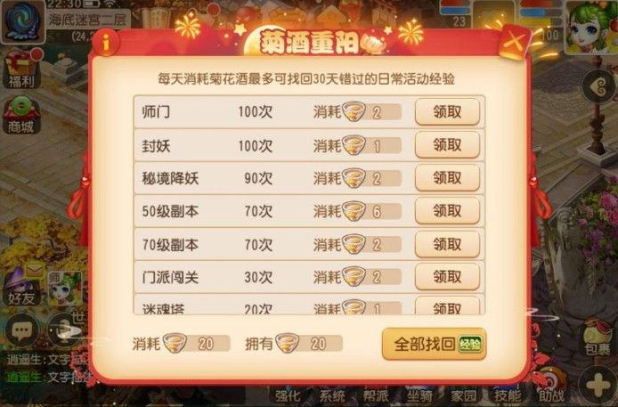 对于喜爱在线下享受假期的玩家,《梦幻西游》手游也将献上菊酒重阳活动。在9月26日~10月14日期间,玩家只要完成日常任务即可获得菊花酒,使用菊花酒即可用于兑换错过的经验。利用这一任务,玩家能劳逸结合,享受假期!
