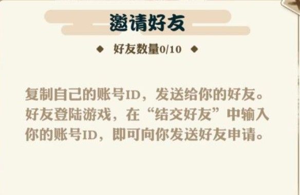 在邀请好友的时候,直接将自己账号的ID复制分享,好友再登录游戏之后可以前往“结交好友”中输入ID的名字,搜索到你的账号之后,发送好友申请即可,添加好友的操作特别简单,要记住需要在结交好友里面搜索哦!
