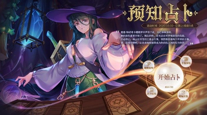 命运神界梦境链接惠惠的预知占卜活动玩法是什么?这次的活动吸引了很多玩家的到啦,这次小编也会给大家介绍惠惠的预知占卜活动的具体玩法,让大家都能知道惠惠的预知占卜活动的内容,想要参与本次的预抽卡活动,那么就和小编一起来看看吧。