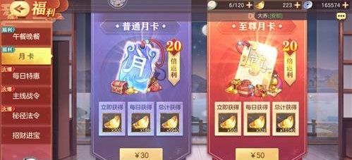 在这边我们是可以看到一个普通月卡和一个至尊月卡的,在这边很多的玩家不知道购买哪个月卡比较好。首先普通月卡我们是花费30元最终每个月可以得到5940元宝,而这个至尊月卡是花费50元每个月最多可以获取到10340元宝,从性价比的角度来看的话这个至尊月卡是明显要比这个普通月卡好很多的。