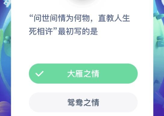 2020年12月17日蚂蚁庄园今日的题目考大家热熟能详的一句诗词了。问的是问世间情为何物,直教人生死相许最初写的是哪种感情。这句词我们在电视还是生活中都会遇到。哪么这句词最开始是描写的哪种感情呢?