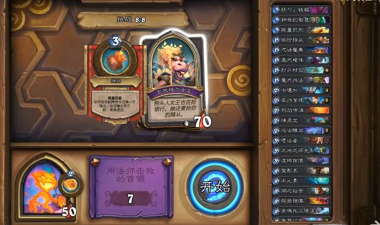 选择宝藏,能量药剂,梦境林地指环,神奇的智慧之球,炸弹天降。打法,能量药剂免疫疲劳,利用卡德加特效召唤为主,手牌尽量留获得卡牌的牌。