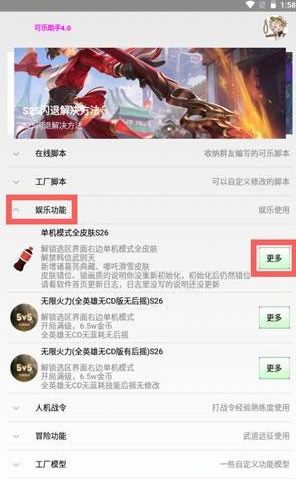 4、点击功能大全中的【娱乐功能】,找到单机模式全皮肤,点击【更多】;
