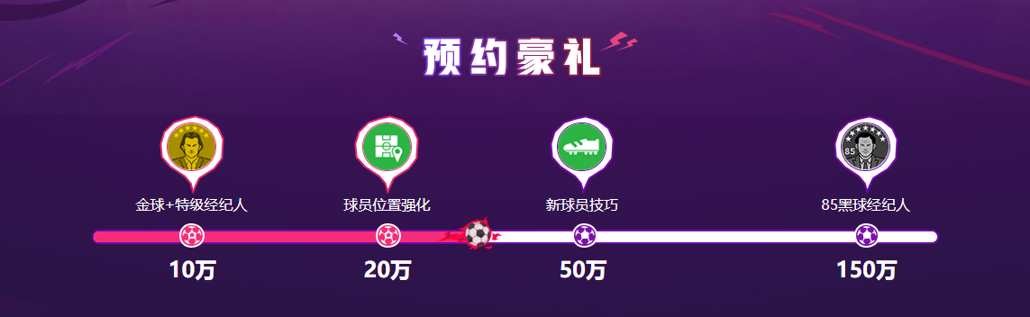 《实况足球》手游2020此前开启公测预约,预约福利也同步上线。随着预约人数的持续增加,会解锁不同的公测奖励。第一阶段10万人预约奖励:“金球+经纪人”以及第二阶段20万人预约奖励:“球员位置强化”道具都已经成功解锁。球迷玩家热情持续高涨,预约人数即将到达50万,第三阶段“新球员技巧”的道具奖励解锁在即。最终压轴福利也即将来袭。预约人数达到150万人,所有预约玩家都将在公测时获得85黑球经纪人*1!
