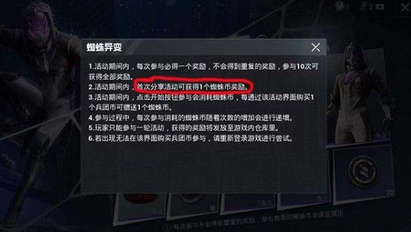 同时,光子这次还给玩家安排了一个小彩蛋,那就是玩家可以通过分享活动获取1个蜘蛛币,作为这次抽奖的道具使用,虽然1个蜘蛛币只能算是杯水车薪,但是也能用,而且获取方式只需要简单分享就可以。