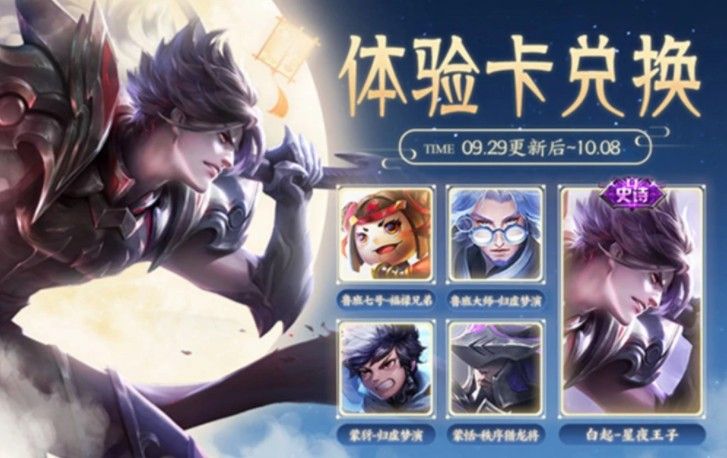 第二个就是体验卡兑换活动了,本期热门体验皮肤是白起的星夜王子,还有鲁班七号的福禄兄弟等等,而惊喜和幸运礼包则能开出百里兄弟的永久伴生皮肤了,虽然概率只有0.1%,但还是有机会的!