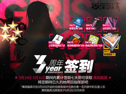 值此三周年之际,《少女前线》为了感谢所有玩家三年来的支持,特意举办“五星免费送”活动,现在登录游戏累计签到七天即可获得“真核面具”,真核面具可用于兑换任意一个可制造的五星人形!