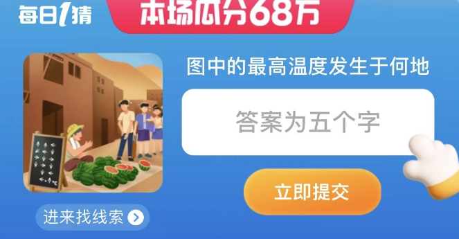 淘宝7.11每日一猜答案是什么?今天的问题答案引起了很多玩家的讨论,大家需要看图来猜出图中最高的温度是什么地方,这个问题可以去题目旁边的线索里面寻找答案,详细的答题解析可以查看本站小编分享在下面的攻略。