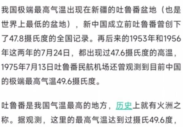 吐鲁番的夏天最高温度历史记录是49.6摄氏度,夏天平均气温47左右。