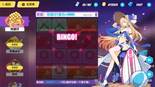 每个奖池达成BINGO后即可进入下一个奖池,每次翻出〇即可获取「秘银」×300。在活动第一天只能开启第一个奖池,后续奖池有开放时间限制会陆续开放。其中第7个奖池为可重置奖池。可重置奖池在Bingo成功后,将不可再翻开其他格子但可以消耗「吼姆饼干」×10重置该奖池。之后就可以再次翻开奖池的格子获取奖励,可重置次数为99次。