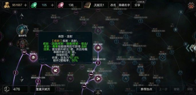 流派技能的话是4毒,因为4个剧毒技能都有不错的收益,大招在5层叠满的时候无视怪物护甲造成伤害,瞬移毒雾是为了叠毒触发bd中的小天赋点,速射,就是有额外一只箭。