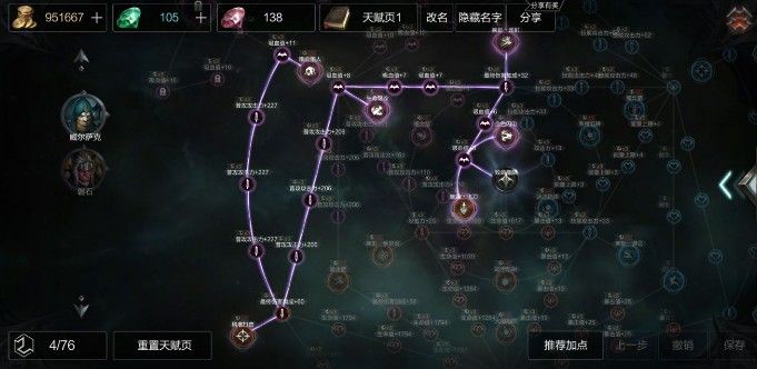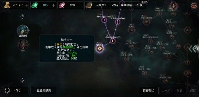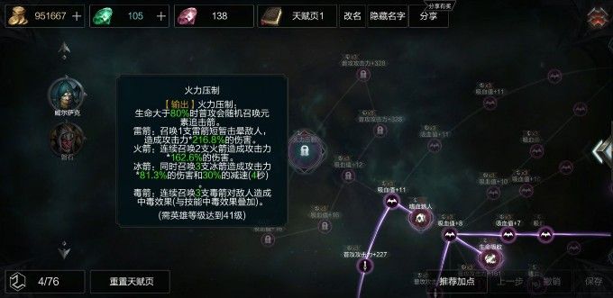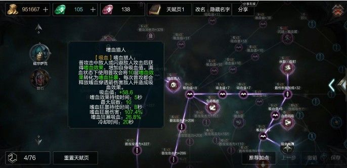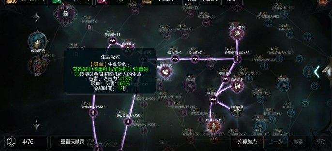 后期准备点出元素+狩猎增加刷怪效率,为什么一开始不往上走是因为上面往左走太多吸血,因为武器问题不需要太多吸血值,往左下走+普攻,并且点出普攻叠加暴击,进一步增加伤害。