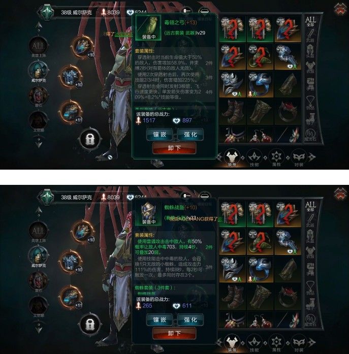 然后搭配两件蜘蛛,是我认为在目前等级当中最合适的,因为蜘蛛套2件套触发的套装技能是,你在攻击时可以有50%概率让怪物中毒每秒造成几百的伤害,并且!可以最高叠20层,这样就可以避免对付单体个别boss伤害输出比较疲软。