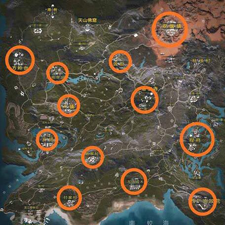 绿色的圈是建议打野玩家去的地方,有一定装备和秘籍基础之后在去橙圈找人打架,游戏还是比较简单的,面对敌人的时候,出招不能贪,如果只能打3下,就绝不打第4下,基本上1V1的情况下,不会有什么问题,至于混战的话,别人打起来的话,现在旁边走走走,多观察一下其他玩家的状态、装备以及位置,免得被偷袭死。