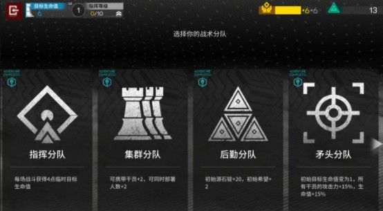 矛头分队:初始生命值只有1,但是所有干员攻击、生命各+15%,通关时生命值大于10解锁。这个分队比较适合给操作强运气好的博士提升操作上限用,但是容易暴毙。