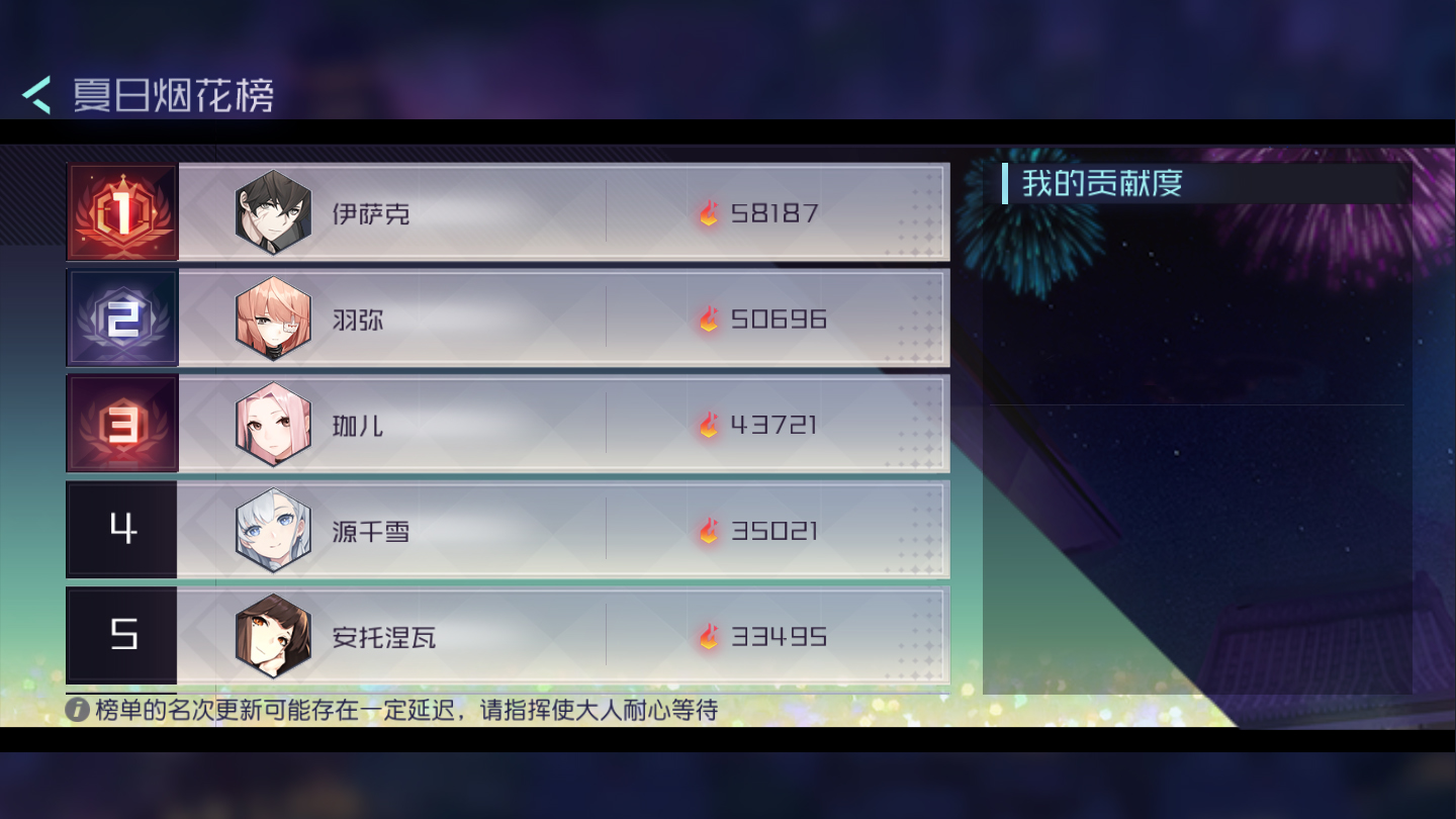 夏日祭上,还有什么能比花火大会更让人兴奋呢?每晚的19-24点,交界都市会举办盛大的夏日花火大会。指挥使大人可以为自己心爱的神器使燃放烟花,开启专属剧情的同时还可为夏日烟花榜增加自己的贡献度。