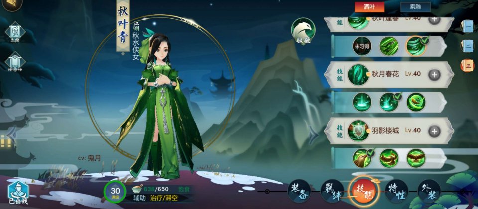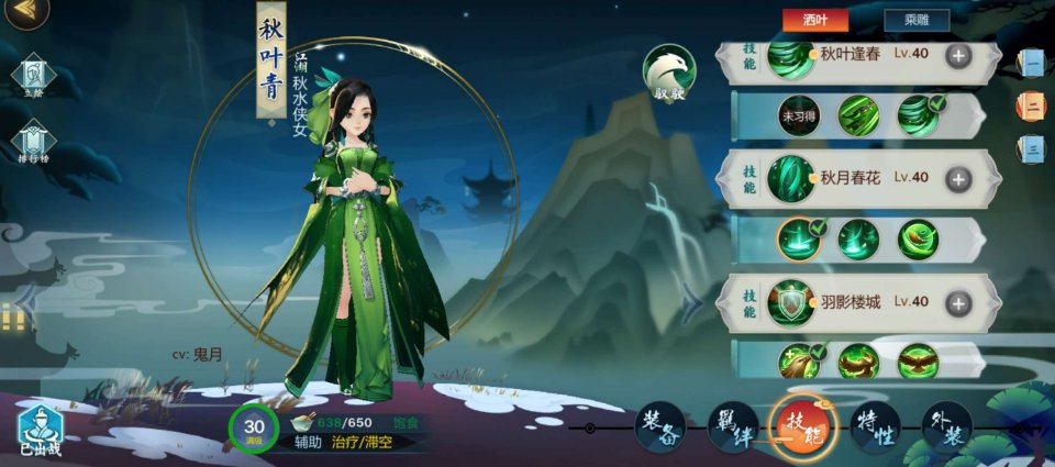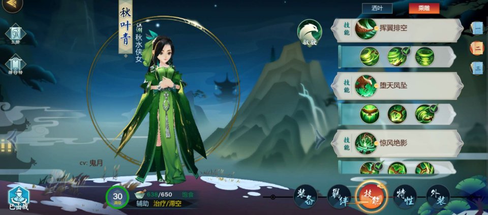 二技能秋月春花:残页 (招式疗效提高20% 有效范围增加20尺) {秋叶青唯一一个范围治疗技能cd极短 但范围与治疗量皆偏低 残页可以补缺}
