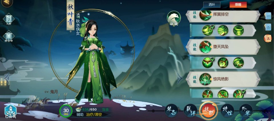 一技能金羽横云:残页或绝章 (残页:大雕不再俯冲 改为原地用利爪攻击前方目标 绝章:领悟新招式‘秋叶逢春’在自身半径20尺范围能选择一名队友为其回复气血值) {秋叶青的双状态使得她打本有两种选择 残页的更改攻击方式与绝章的转换为治疗技能 皆适用于打本 看个人喜好}