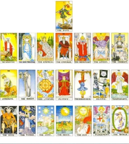 1.一位造梦师时常在自己梦中梦到两张图片,一张是大阿卡那牌组合(图一),另外一张是小阿卡牌组合(图二),他对此十分困惑,便向身边人求助。