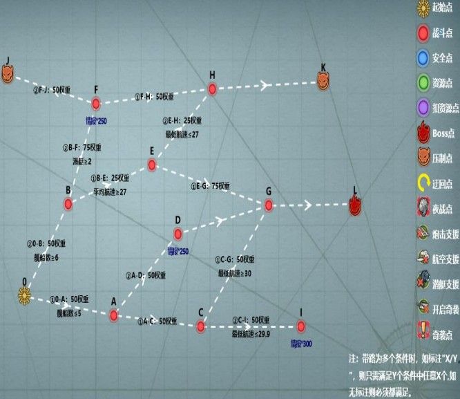 (A-C-I)赤城旗舰,带任意四航母,C点是一个二星沟,保证舰队的最低航速<30,踩到I点有300情报拿