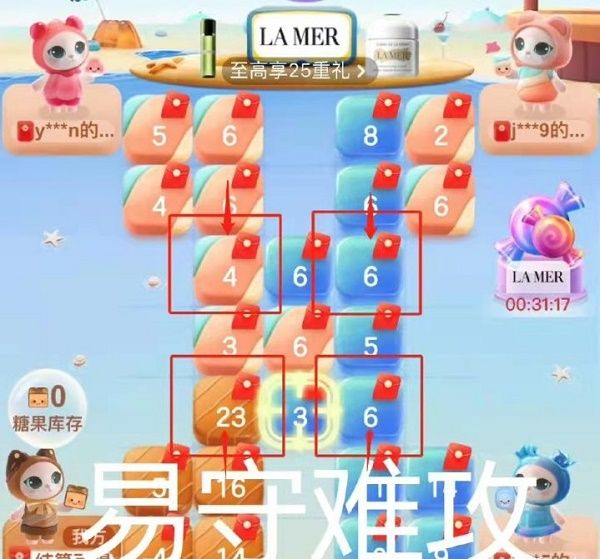 在如此条件下,就如上图而言,左下角的第一块红色18的数字格子,是完全不用积累到这个数值的,因为这才只是你踏入江湖的第一步!这里只要是初始数字(即一次投掷骰子的点数)即可。只要你的龙头部队能够快速的进军对方阵地,后面的格子完全不用防守!所谓最锋利的矛就是坚韧的盾!减少无作用的防守,将剩下的糖果支援前方阵线!