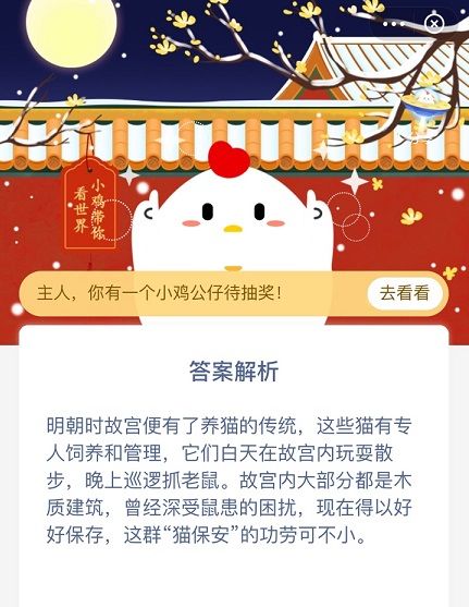 所以在古代的时候,故宫养猫传统是为了抓老鼠的,不像我们现在养小猫咪是为了娱乐当宠物而已。蚂蚁庄园12.25的正确答案已经分享了,各位同学们现在知道了故宫养猫传统的原因了吧,明天同一时间咱们不见不散哦!