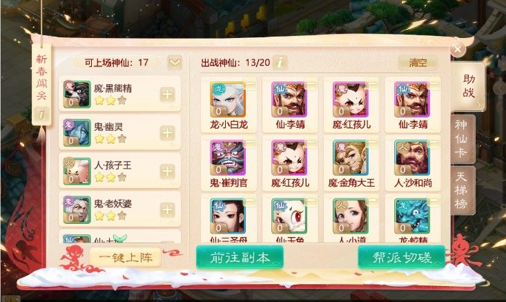 届时玩家在游戏中通过每日活跃度或副本通关收集请神符道具,就能召唤神仙助战,并可对神仙进行培养和搭配。玩家自主搭配神仙卡组后还可以进行切磋和每日对战,还能够在帮派频道组织“神仙擂台”,邀请帮派好友进行切磋。