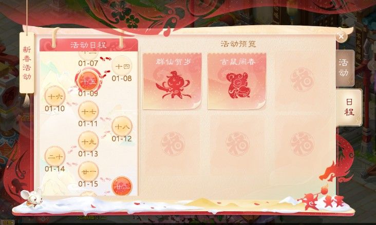 1月9日维护后,在道具服情系今生、玉京天阙、九州共饮,以及时间服风生水起、鸡年大吉的侠士们,将抢先体验到趣味十足的2020年春节活动!驱赶年兽、群仙贺岁、真心不亏、幸运吉符、新春游龙、吉鼠闹春……体验更多游戏乐趣,还有机会获得丰富的道具和经验奖励!