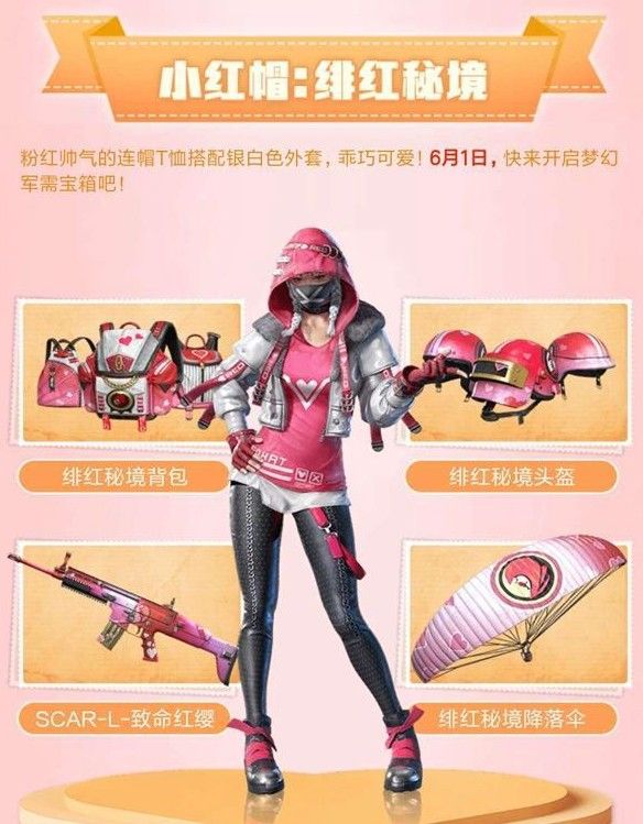 这套皮肤除了最基本的上下装以外,像背包、头盔、降落伞和枪支皮肤都是齐全的,时装专属的SCAR-L致命红樱更是足以惊艳到玩家,套装凑齐一套是十分好看的,以粉色为主色调的绯红秘境套装相信一定能够受到女性玩家的的欢迎。