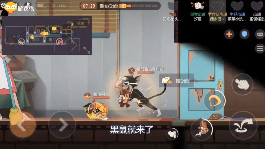 想法是不错,但是现在就点炸药堆是不是早了点,连老鼠都没有抓到,看来这只猫是非常自信的,我和剑杰推到一半,黑鼠就来了,这剑杰反应也太慢了,黑鼠过来开门了还不走,直接就被黑鼠抓了,也不知道这黑鼠是怎么想的。杂物间炸药堆都点了,结果却抓着剑杰往庭院去了,我过去救人结果被黑鼠一抓打残血了,这伤害是真的高,队友也抓住机会,用花瓶砸晕了黑鼠,救下了剑杰。
