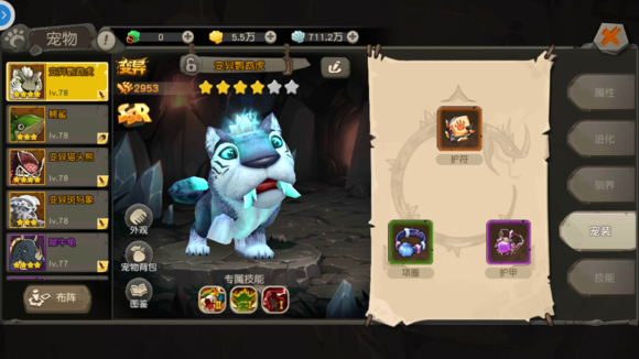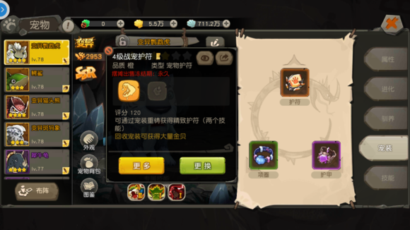 其中护符可以为宠物附加额外的被动技能;项圈随机附加属性,护甲附加防御属性,与人类有所不同,宠装只有绿蓝紫橙色四种等级。