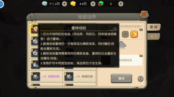 加工宠装会依据宠装品质、部位、普通或精致消耗不同数量的道具。加工后宠装的属性或技能会完全重置,不可逆转。