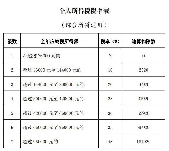 1、本表含税级距中所称全年应纳税所得额是指居民个人取得综合所得以每一纳税年度收入额减除费用6万元以及专项扣除、专项附加扣除和依法确定的其他扣除后的余额。全年应纳税所得额-综合所得金额-各项社会保险金-专项附加扣除-起征点6万元的余额。