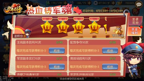 本次庆建军节除了上述两个活动外,还有欢乐抽奖、月基金、冰雷马、如意特卖、机关兽等活动陆续上线,让你的八月绝不无聊,随时随地都能在《少年名将》的世界中畅爽游戏,感受三国征战的魅力。
