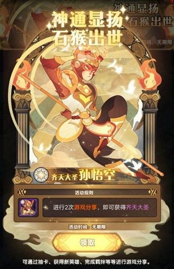 这次的任务是神通显扬石猴出世活动中的一个环节,玩家要进行两次游戏分享才可以,目前玩家还没有找到分享的方法,所以获得齐天大圣的人非常少。想要完成进行两次游戏分享的任务目前是有三个的,用抽卡、完成羁绊或者是获得新英雄都可以,当然想要获得齐天大圣可以用另外一种方法,那就是每天完成活动的任务,可以得到100点任务点换齐天大圣。