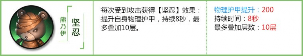 护甲反伤流的磐石适应用熊乃伊,物理护甲越高,反伤的伤害越高。想必天赋点最高+64物理护甲,熊乃衣能8秒内最多叠加2000物理护甲,而且技能效果没有CD,可以一直叠加。每次升级技能提升95物理护甲,虽然属性加成偏低,但培养简单,平民党不妨考虑一下。