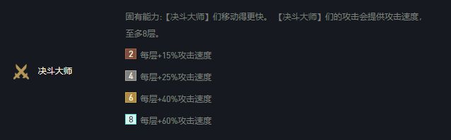 另外一个说过的6决斗吃烂分强势阵容也是如此,被死亡凝视了。攻速加成直接从15/25/40/60%降低为12/20/35/60%。