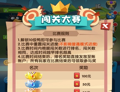 比赛模式赚奖励和钻石积分,解锁10级鸭即可参与比赛。比赛时间内根据闯关数进行排名,闯关数相同,达成时间越早排名越高。比赛时间结束之后,排名奖励直接发放至账户,所有玩家在比赛结束后可领取参与奖。