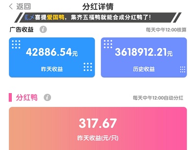 两只37级鸭合成有概率获得分红鸭,集齐敬业、友善、和谐、爱国、富强鸭,合成必然获得分红鸭。分红鸭每天可获得平台的广告收益分红,每天中午12点,根据昨日全网分红鸭数量,瓜分昨日20%的广告收益。根据目前的数据来看,一只分红鸭一天可以获得300元左右的广告分红。