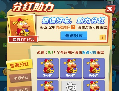 邀请好友助力分红,每日邀请有效好友达到指定人数时,即可激活对应分红转盘。每个分红转盘每日仅可抽取一次,抽取次数每日0时刷新。限时分红鸭每隔5秒获得1次分红,每秒获得分红金额为昨日分红鸭可瓜分金额。永久分红鸭每日12时瓜分对应分红,邀请好友达到指定人数时,即可获得永久分红鸭。