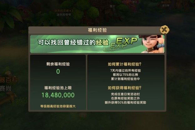 如果出现了某几天没有登录游戏,那是否意味着错过了许多经验和升级的机会呢?不用担心!游戏为玩家们提供了“福利经验”功能,你可以将7天内错过的所有经验以75%的比列储存到“福利经验池”中,而这些储存下来的经验只要通过完成任意日常活动,都将会获得额外的50%福利经验奖励,直到福利经验池中的储存经验消耗完。这样一来,也能在短时间内追上其他玩家升级的步伐了。