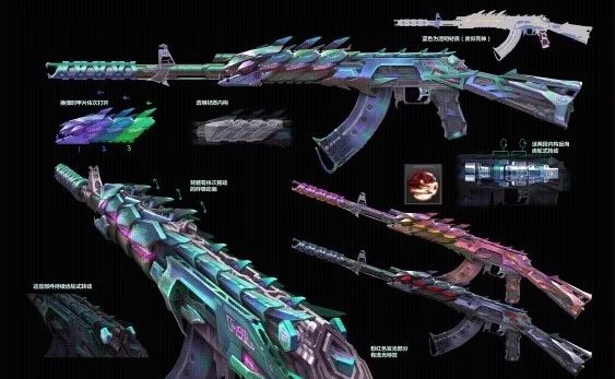 根据AK47-变色龙的武器设计概念图,我们可以仔细观察一下巴雷特-变色龙的整体结构,不难发现它也拥有半透明材质,动态鳞甲和动态色泽外观,看起来非常奇幻。