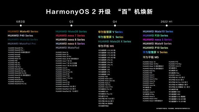 6月2日起,首批启动公测升级HarmonyOS 2的设备包括:华为Mate 40系列、Mate 30系列、P40系列、Mate X2、MatePad Pro。2021年第3季度计划升级华为Mate Xs、Mate 20系列、nova 8系列、nova 7系列、nova 6系列、MatePad等。2021年第4季度,计划升级华为智慧屏V系列2021款、智慧屏S系列、智慧屏X65、Mate 20 X、P30系列、Mate X等。2022年上半年,计划升级华为Mate 10系列、P20系列、Mate 9系列、P10系列等,具体清单和适配时间请关注官方公布信息。
