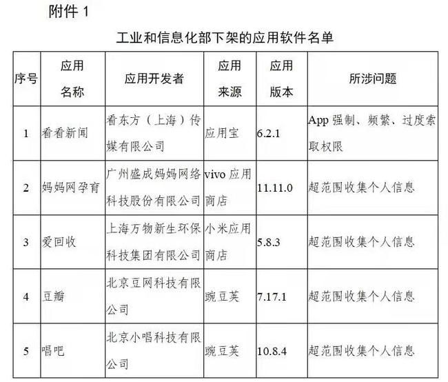 截至目前,尚有5款App未按工信部要求完成整改,包括看看新闻、妈妈网孕育、爱回收、豆瓣和唱吧5款App。各通信管理局按照工信部统筹部署,积极开展App技术检测,截至目前尚有101款App仍未完成整改。