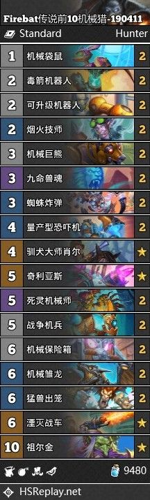 这套猎人是firebat打到传说前十的一套猎人卡组,强度有足够的保证。