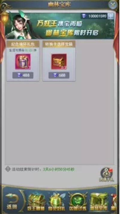 活动期间,可在幽林宝库购买各种稀有物品:凶兽魂环-万妖王之眼,转换卡选择礼包隆重登场。机不可失,失不再来!