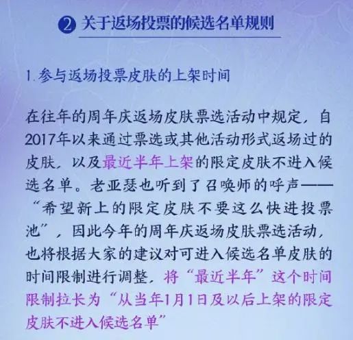 以往的皮肤返场规则,是半年内上架的皮肤不会进入候选名单,然而今年则将限制拉长,从半年,变成了当年的1月1日,也就是说今年上线的皮肤不会在这次的投票池中候选,那么五岳、如梦令、时之恋人、snk等皮肤是没资格进入投票池的哦。