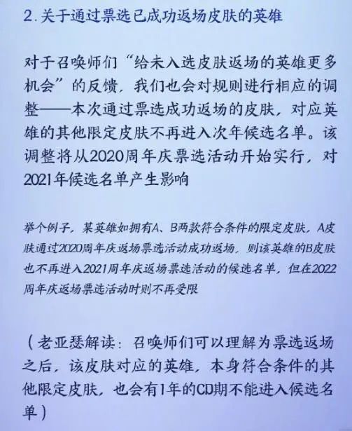另外这次的皮肤返场也会以“英雄”为单位进入冷却期,什么意思呢?拿猴子举例,假设今年至尊宝通过票选活动成功返场,那么21年的周年庆大圣娶亲就不会进入候选名单中,在22年的周年庆才会开放这个资格。