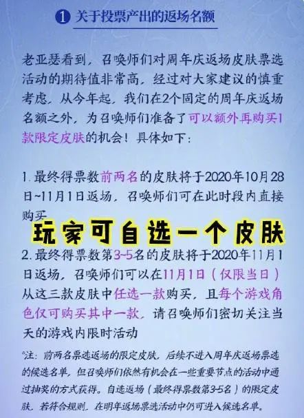 以前的返场都是一个规则,玩家投票,票数最高的两个皮肤将会在周年庆期间返场,而这次的活动将新增一个机制,那就是票数排名3-5名的皮肤会在11.1日当天返场,前两名的返场时间是10.28-11.1日,3-5名皮肤只有一天的购买机会哦,大家别错过。