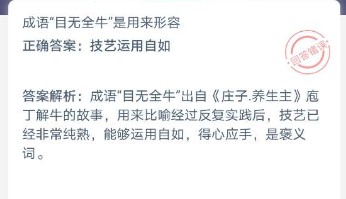 蚂蚁庄园12月27日带来的新问题已经更新,下面有目无全牛这道题的具体介绍,成语目无全牛的含义和这道题的答案,其实只要能充分的了解目无全牛就知道答案是什么了,在不知道答案选择什么的情况下,可以直接通过本站小编准备的攻略,可是的找到正确答案。